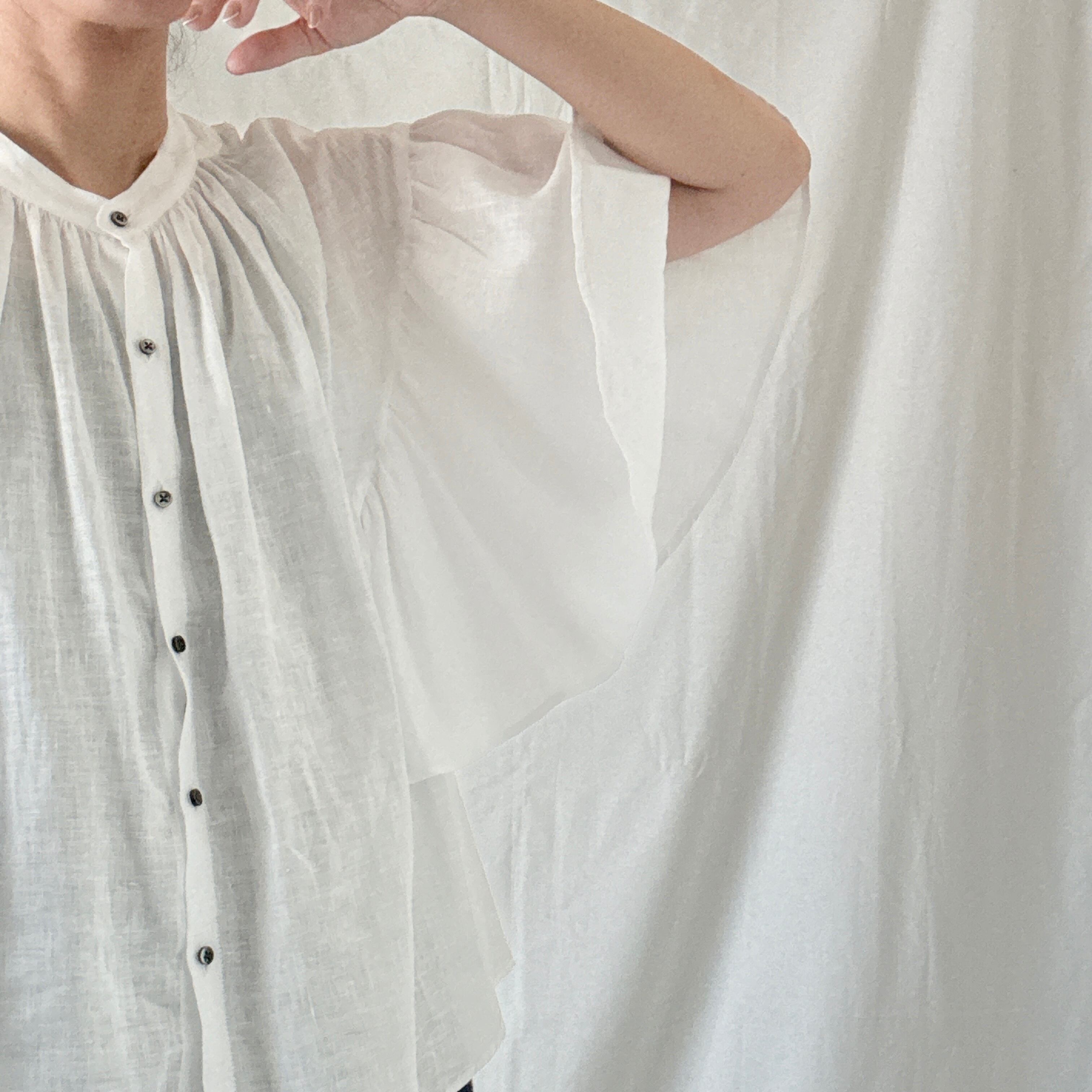 MANON定番のアミカルシャツのデザインに、女性らしく着映える変形ギャザーフレアスリーブを施しています。