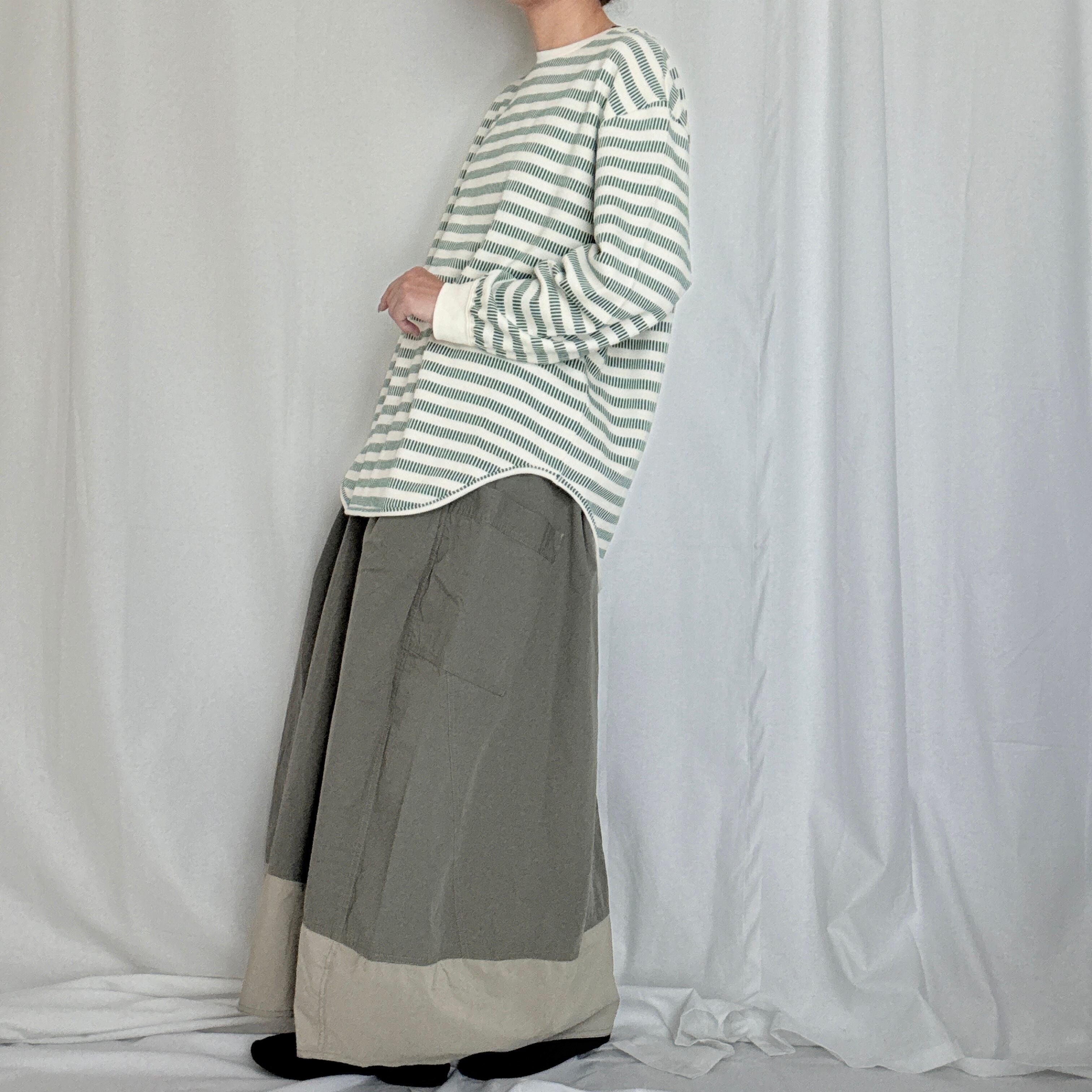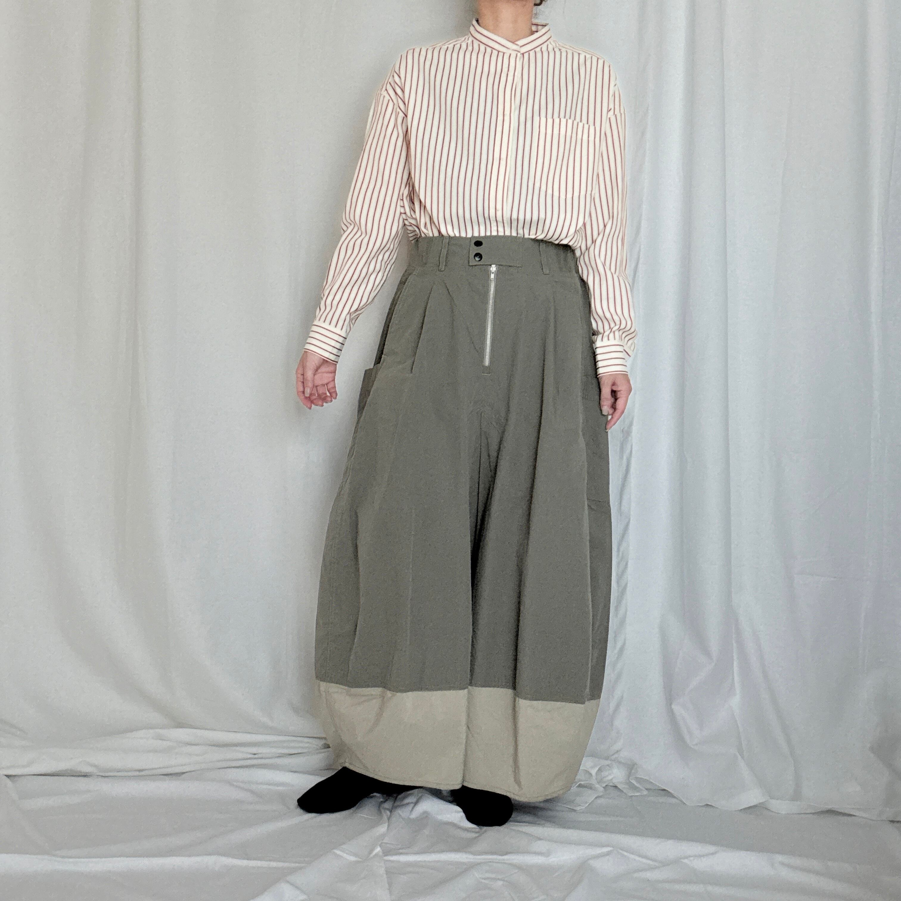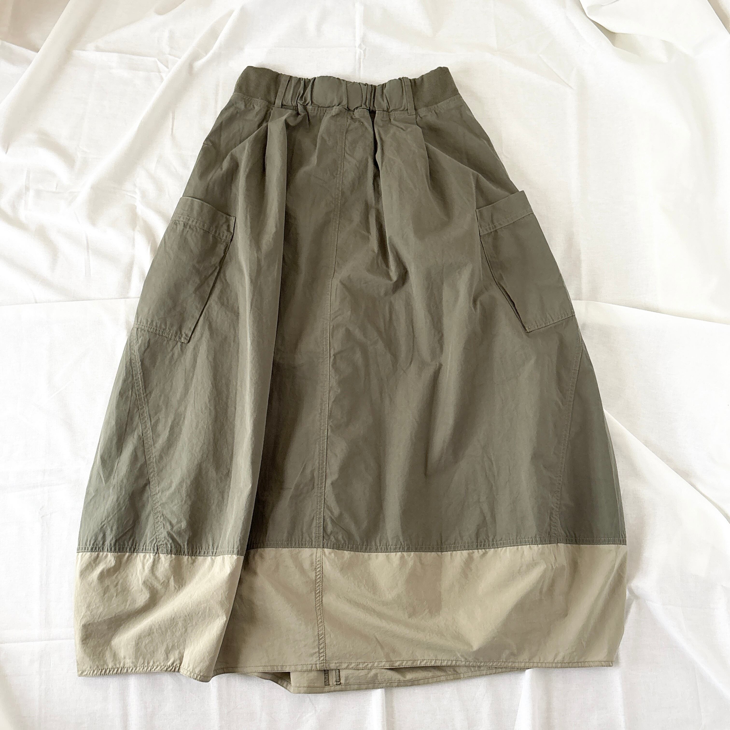 ワイドパンツのような立体感、バレルシルエットで魅せるミリタリーロングスカート。