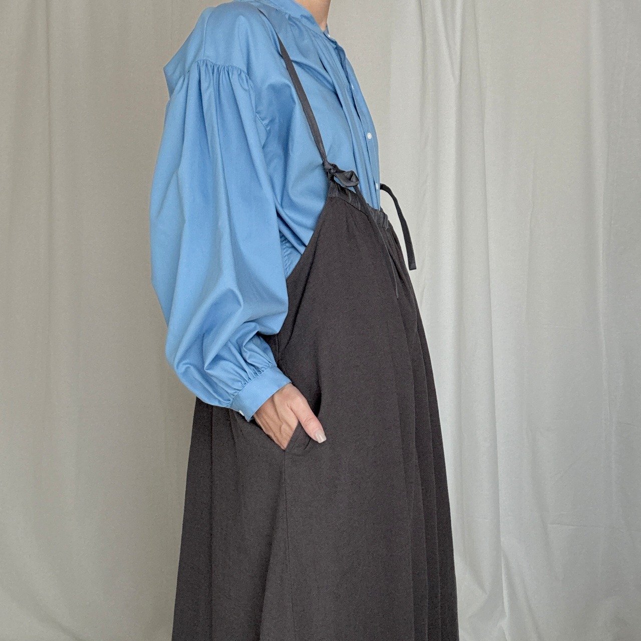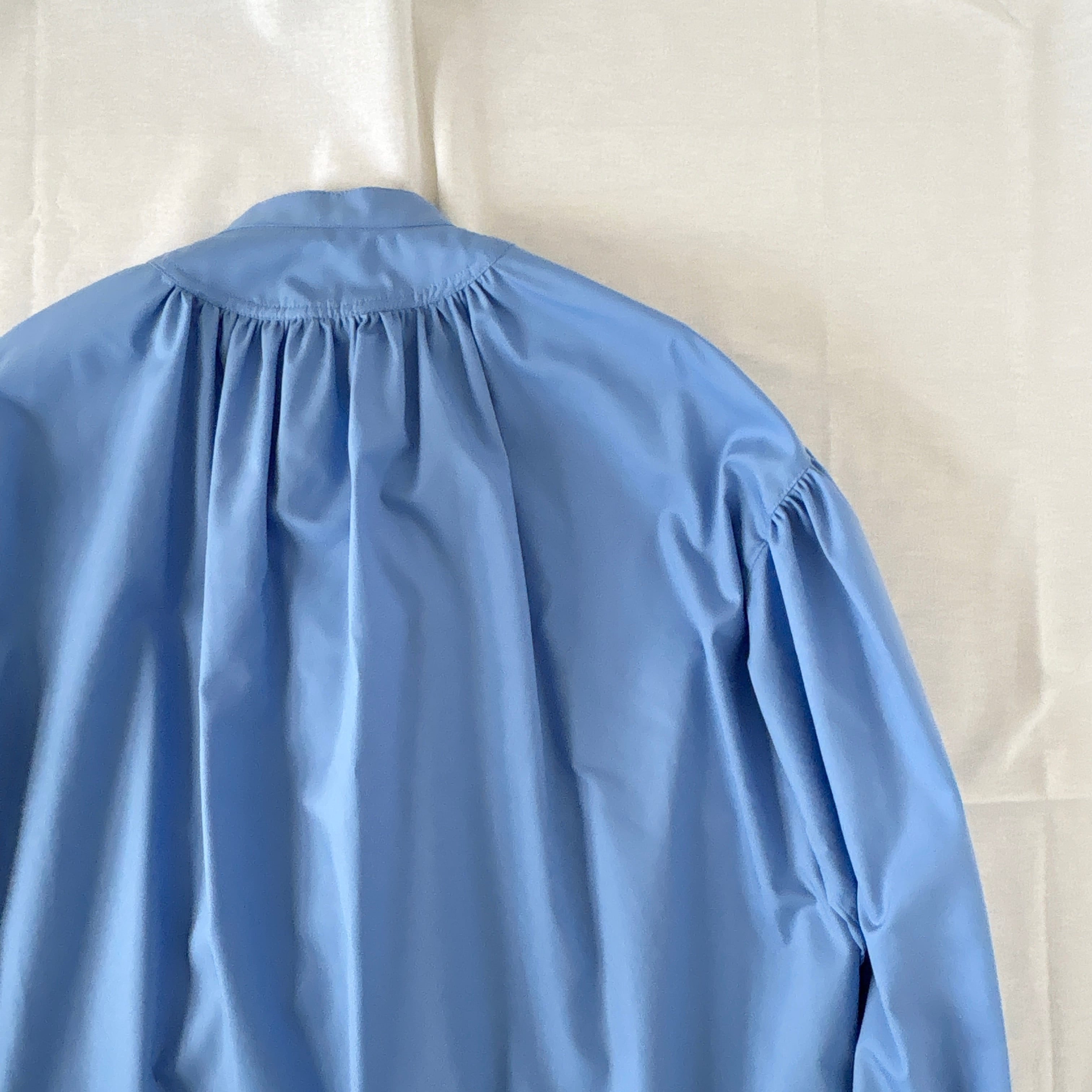 衿はバンドカラーで肩を落とし、衿周りから後側、袖口にたっぷりとギャザーが入った柔らかな膨らみのあるMANON定番のアミカルシャツです。