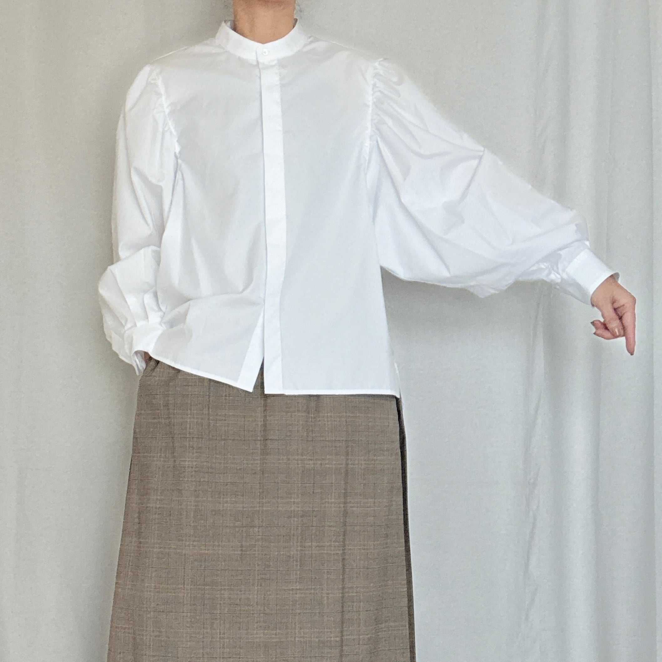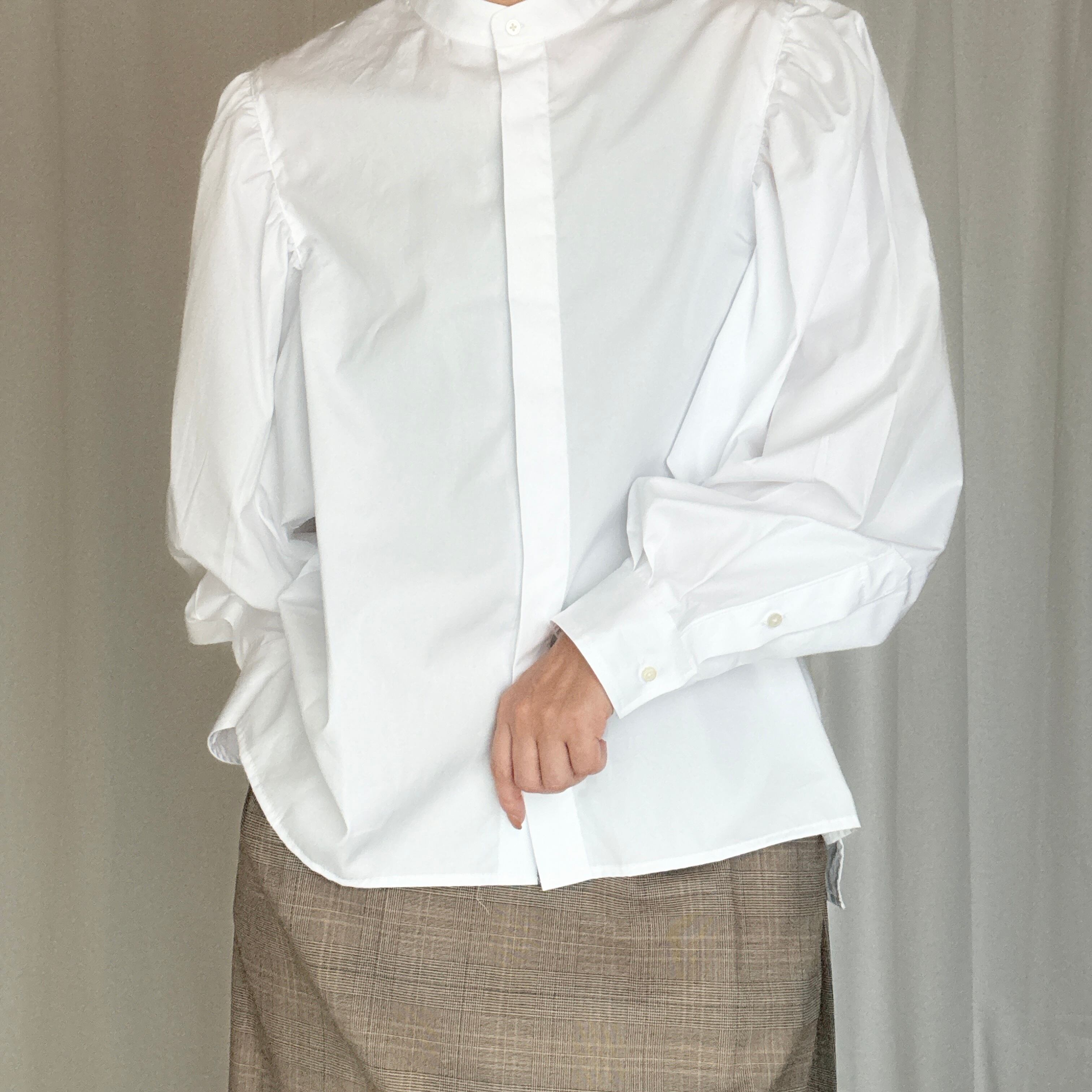 お袖が大胆なボリュームのバンドカラーシャツです。