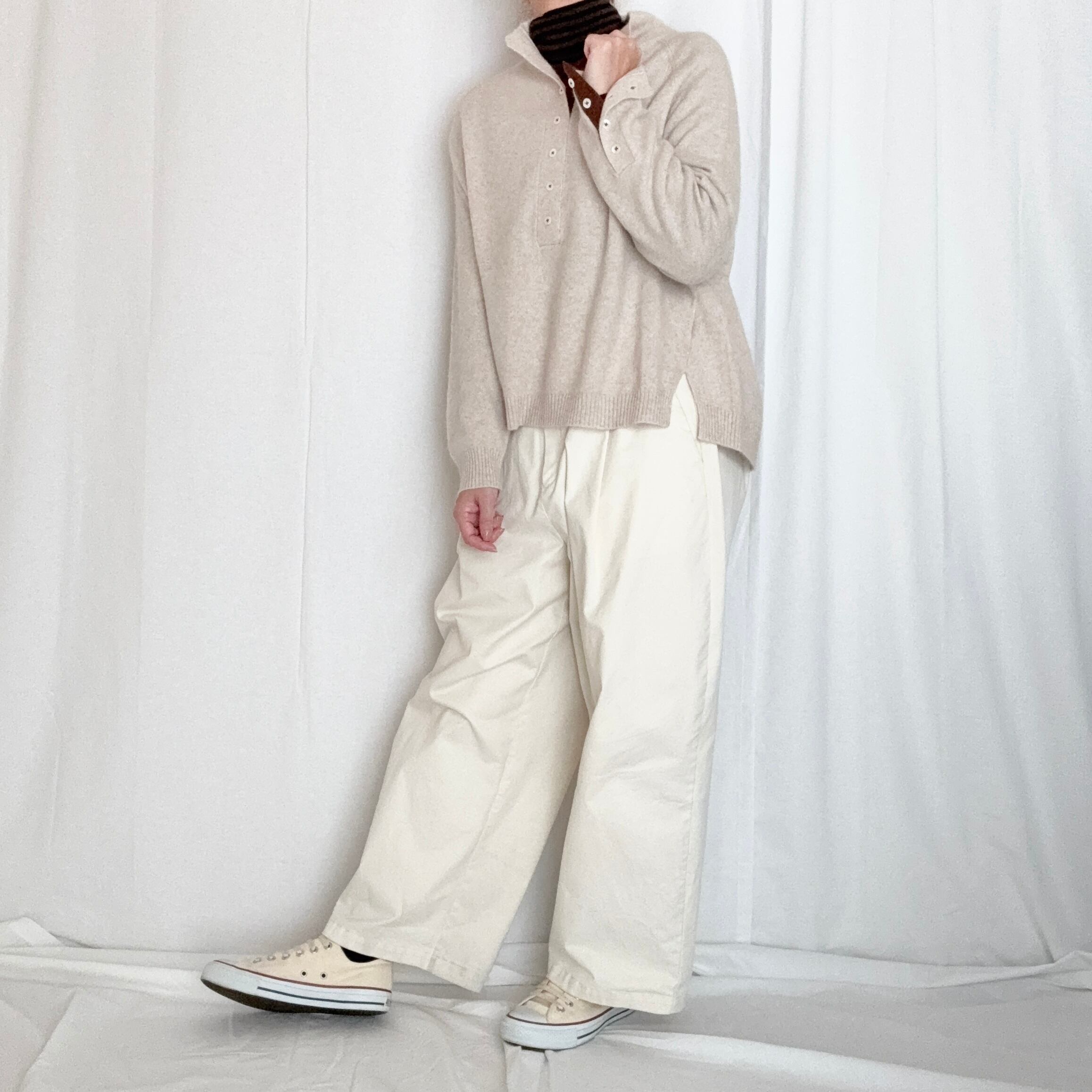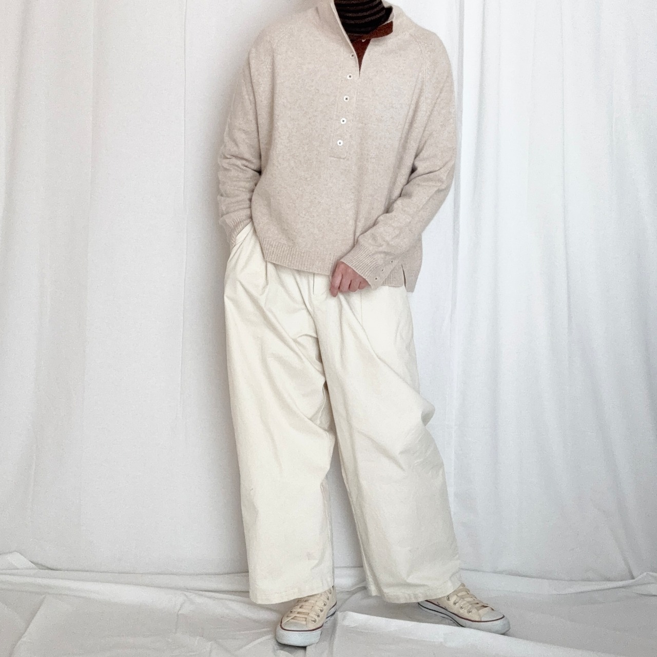 袖カフス仕立てやヘンリーネックデザインが単調になりがちなハイネックニットを格上げデザインしているので、きれいめ素材のボトム合わせで大人のリュクススタイルに。